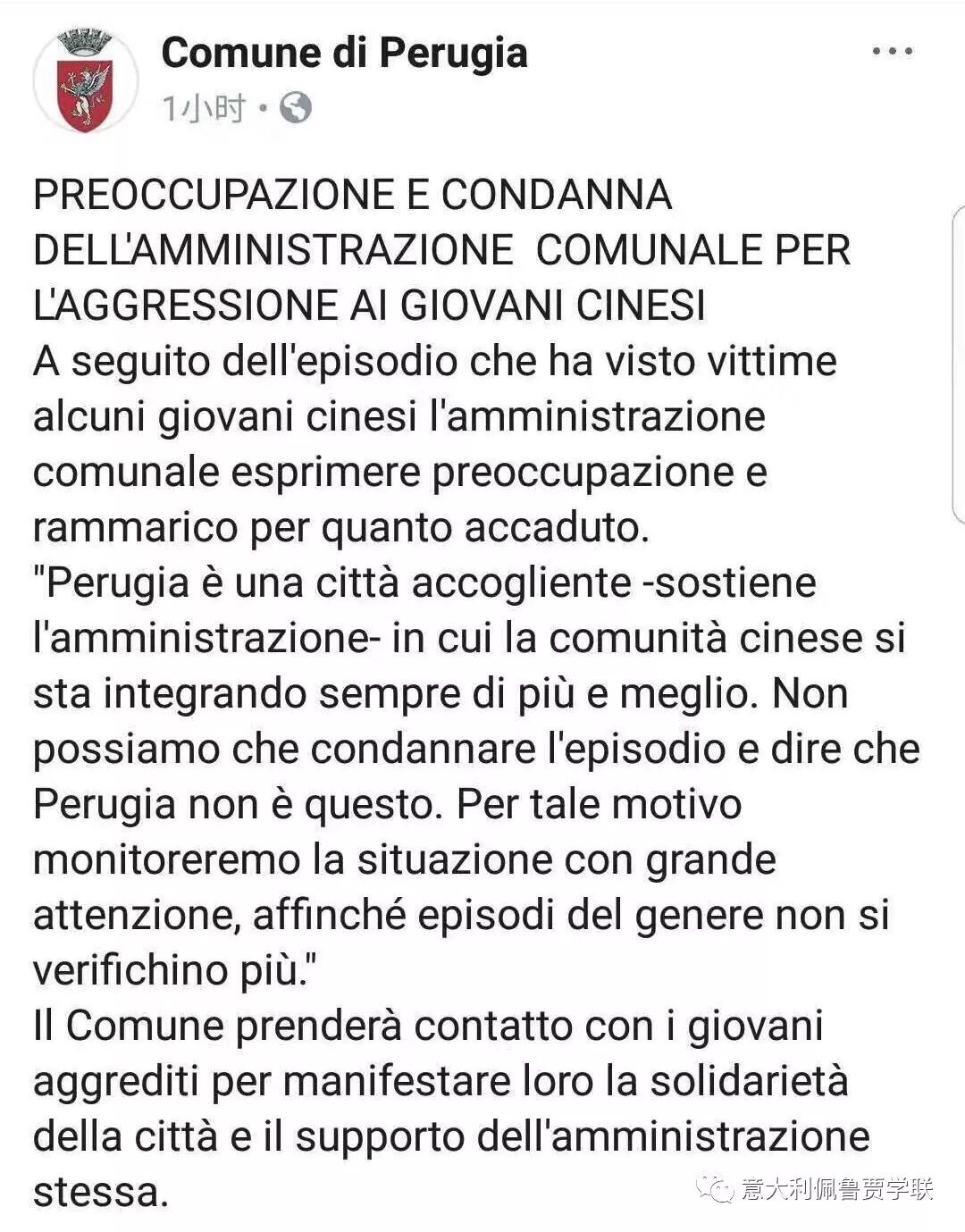 近日发生在佩鲁贾的两名中国同学被侮辱殴打事件,引起了多方媒体的关注,并出现了一些不实的报道。为避免以讹传讹和不负责任报道的扩散,佩鲁贾学联根据当事人的讲述和相关部门的调查,现将此事件及处理进展情况通报如下。
