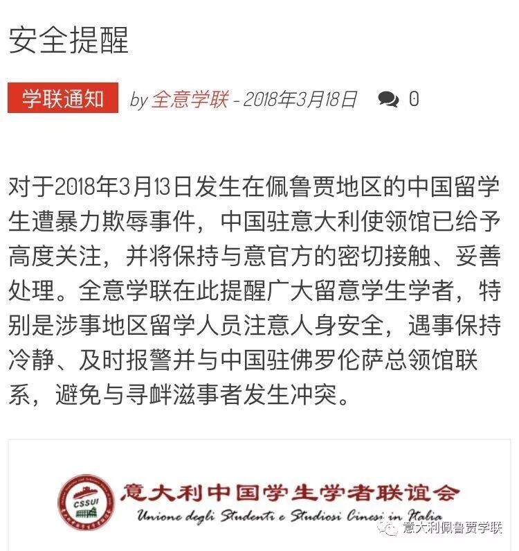 全意学联3月18日上午针对该事件发布了安全提醒。全意学联秘书长及全意学联中部地区负责人受使馆教育处委托专程来到佩鲁贾了解相关情况。针对佩鲁贾学联骨干介绍的佩鲁贾留学生数量较多,其中很多是新生的情况,及反映的同学们希望了解自我防护知识,在佩鲁贾举办平安留学和领事保护进校园活动的愿望, 全意学联也向使馆教育处进行了汇报,并且争取在未来的工作中尽快落实。